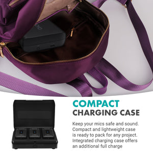 The entire system stores perfectly in a molded hardshell charging case. The system has a 7 hours battery life, and the charging case can hold an additional full charge for recharging on the go. The transmitter and receiver also have USB-C ports for charging with the included USB-C charging cable. The charging case and all accessories fit snugly in a carrying pouch for easy transport.