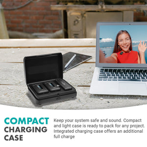 • LONG LASTING BATTERY, LONG RANGE TRANSMISSION: The WMX-2-L-DUO system offers a 7-hour battery life with a compact charging case that gives you a full additional charge. Stable 2.4Ghz transmission band and Adaptive Frequency Hopping ensure noise and interference-free transmission at distances up to 328 feet