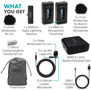 • ULTRA COMPACT TWO MIC IPHONE WIRELESS SYSTEM: Capture pro audio directly to your iPhone with a highly portable 2.4GHz wireless system. With two wearable microphones/transmitters and an Apple Lightning receiver, you'll have everything you need to record and stream with your iPhone