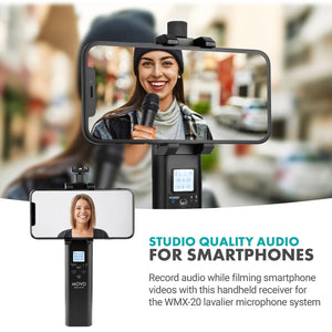 This convenient all-in-one wireless receiver and smartphone rig for the WMX-20 can receive wireless signals at distances up to 330 feet