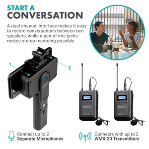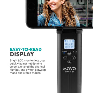 The Movo WMX-20-SP UHF wireless receiver is designed to connect your smartphone with microphones and transmitters in the WMX-20 family. The receiver’s hand grip design allows it to double as a portable smartphone rig for recording videos, and can accommodate devices of all sizes thanks to its adjustable clamp. Dual-channel design allows the WMX-20-SP to pair with up to two transmitters at once, ideal for interviews and dialogue scenes. Able to receive transmission from up to 330 feet away, the WMX-20-SP is perfect for outdoor shoots and wide open locations. Includes a free one-year warranty and friendly customer service based in the U.S.A.