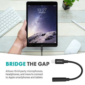 Plug your favorite earbuds, microphones, and more into your iPhone or iPad with the Movo IMA-2 3.5mm TRS to Lightning Adapter. Featuring a male Lightning to female 3.5mm TRS connection, this adapter dongle enables compatibility between iOS devices with Lightning input jacks and third party electronics with male TRS connectors. The compact Lightning connector was designed to work with video camera and smartphone rigs, allowing it to easily plug into tight spaces. Product also includes a free one year warranty, as well as friendly customer service based in the U.S.A.