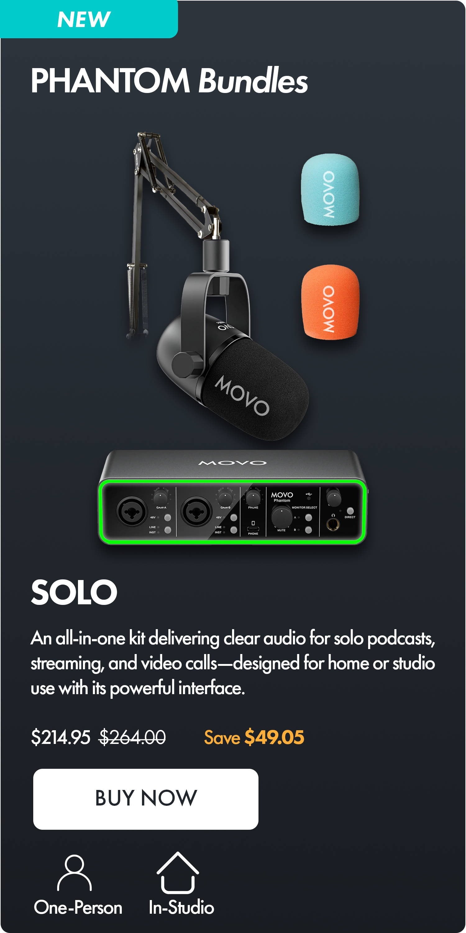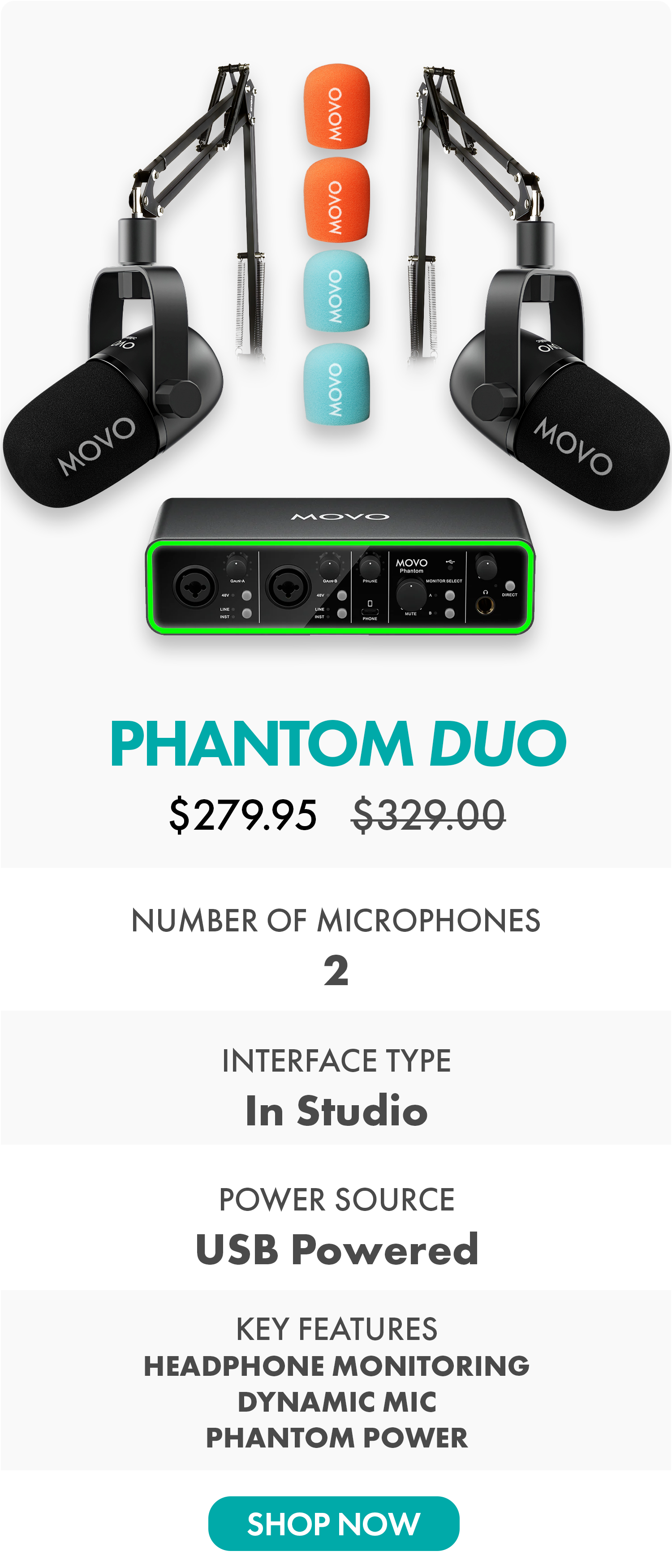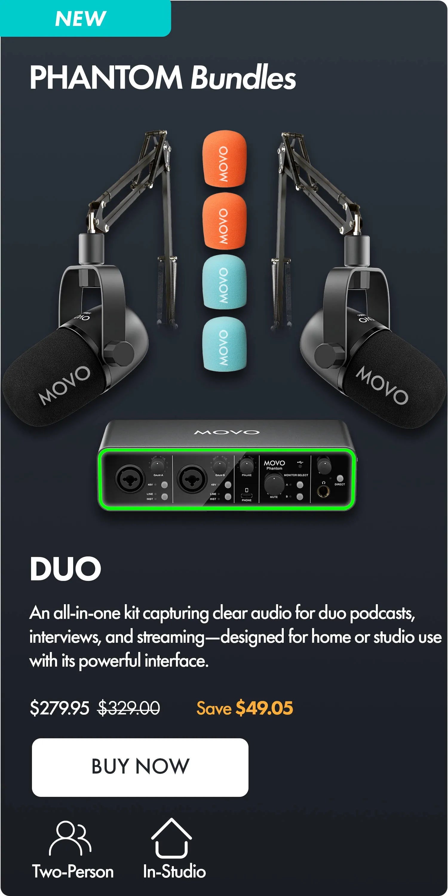 To start a podcast, you need a microphone, an audio interface, headphones, and recording software. If you’re recording with a co-host, you’ll also need a dual-input interface and multiple mics. Our Movo Podcast Bundles provide everything needed to record high-quality audio with plug-and-play convenience.