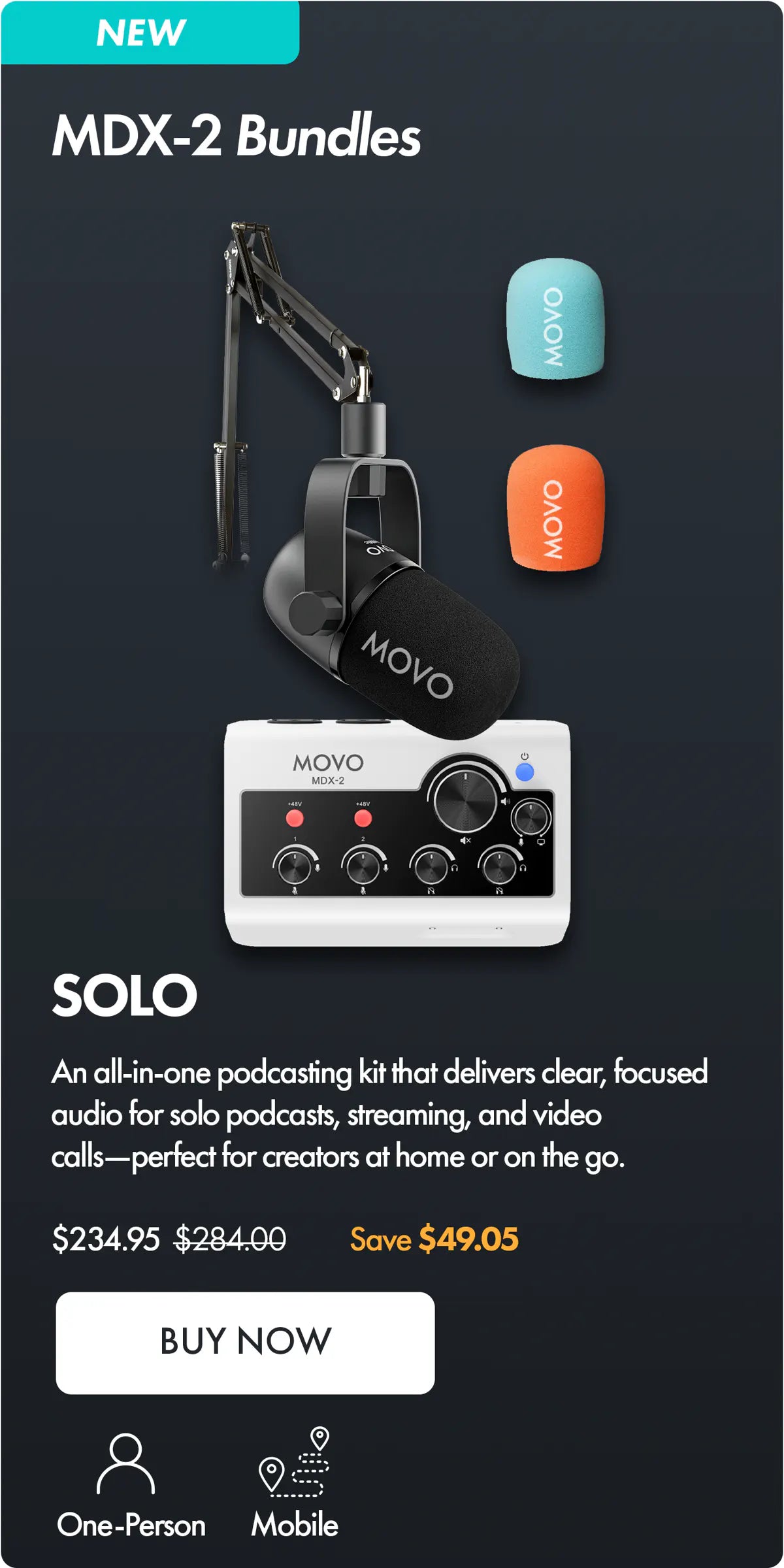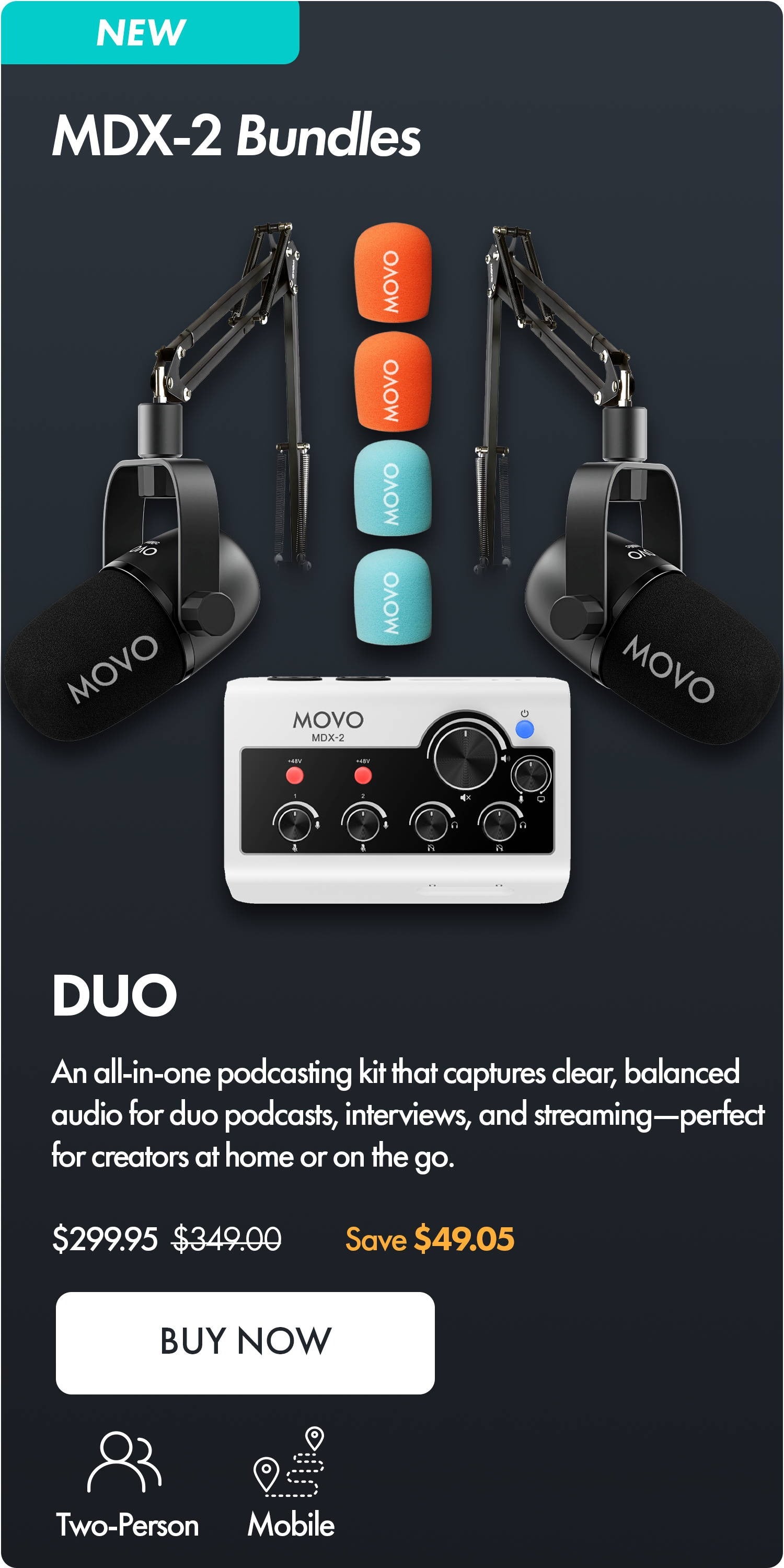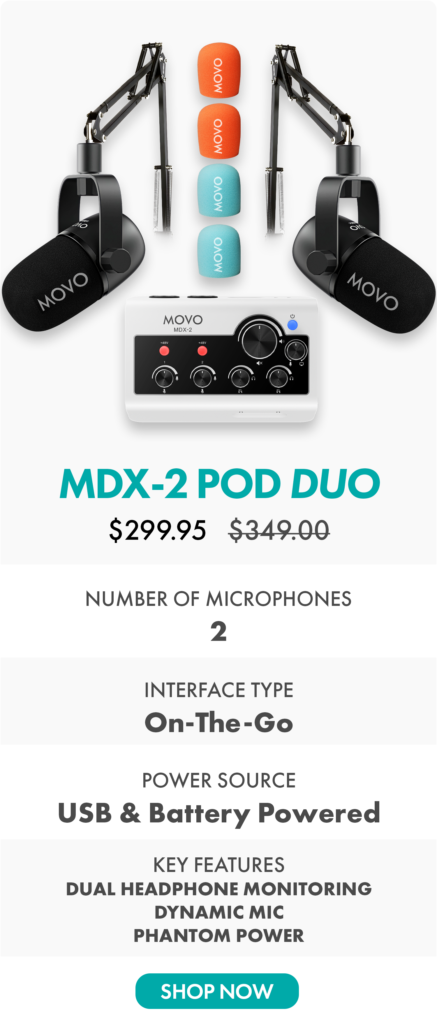 To start a podcast, you need a microphone, an audio interface, headphones, and recording software. If you’re recording with a co-host, you’ll also need a dual-input interface and multiple mics. Our Movo Podcast Bundles provide everything needed to record high-quality audio with plug-and-play convenience.