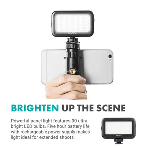 The LED-30 is a powerful panel light that will make every frame in your video pop. Its 30 ultra bright LEDs can be set between 3 brightness settings and have a battery life of up to 5 hours. The bundled micro USB cable makes recharging a cinch, and the light’s compact profile makes it ideal for mounting on rigs.