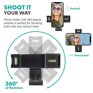 The PR-3 smartphone rig is a versatile shooting platform that doubles as both a camera cage for your smart devices and a handheld grip for mobile photography. An adjustable phone holder can take iPhones and Android smartphones up to 3.9” wide and features full 360 degree rotation, perfect for switching between vertical and horizontal shots on the go. Two cold shoe mounts allow for a range of accessories to be attached to the rig, and the two built-in bubble levels will help align your shots.