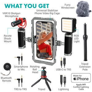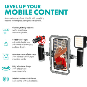 • UNBOX AND CREATE: Complete mobile filmmaking kit includes stabilizer rig, dual wireless lavalier microphones, LED light, and adjustable tripod—everything you need to produce professional-quality video content straight out of the box. Ideal for beginner and experienced creators who want a ready-to-shoot smartphone video solution without hunting down separate accessories.