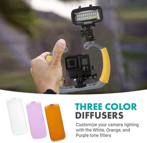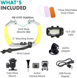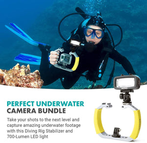 ¡Toma fotos submarinas impresionantes en tu próxima excursión de buceo con este paquete todo incluido! El DiveRig4 es el estabilizador a dos manos perfecto para grabar videos mientras practicas snorkel o buceo. Sus empuñaduras de goma y su correa de muñeca facilitan su agarre, mientras que su resistente construcción de aluminio lo protege de caídas y golpes con facilidad. Las dos zapatas frías te permiten conectar diversos accesorios, y el estabilizador central es compatible con una amplia gama de cámaras submarinas, incluyendo la serie GoPro Hero.