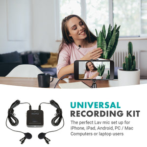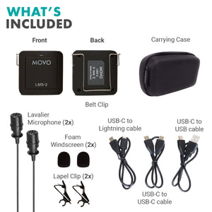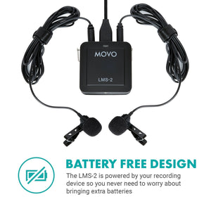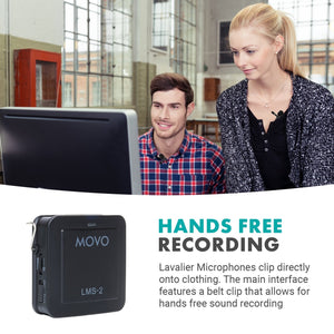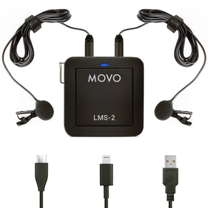 The Movo LMS-2 is a multi-function recording kit with 2 mic-in / line-in audio inputs and 1 audio output. It comes with 2 omnidirectional lavalier microphones that can be used together or individually. Controls on the main interface body allow you to adjust left/right channel volume and switch between mono or stereo recording mode. You can also plug in headphones and monitor your audio in real-time to ensure you're capturing quality sound.