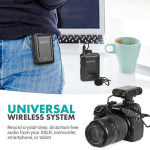 This universal wireless lavalier microphone system significantly improves your audio quality, whether you use it with a standard smartphone/tablet or the highest-quality DSLR.