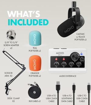 The Movo PodPro podcasting bundle is designed for creators who want a complete, hassle-free setup for both smartphones and computers. It combines high-quality microphones with essential accessories in one portable package, eliminates compatibility guesswork, and delivers professional sound without complex gear or extra purchases — making it easier to start and grow a podcast.
