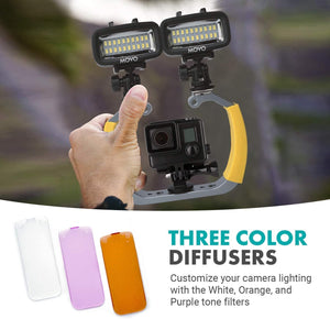 The bundled LED-WP lights project 700 lumens each up to depths of 130 feet. Three lighting modes cover all scenarios: High Power mode brings your photos to life, Power Saver mode is ideal for general illumination, and SOS mode will flash a continuous strobe in case of emergencies. The rechargeable battery lasts up to 7 hours and comes with a USB power adapter. Also included with each LED are 3 attachable color filters for white, orange, and purple lighting.