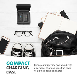 The entire system stores perfectly in a molded hardshell charging case. The system has a 7 hours battery life, and the charging case can hold an additional full charge for recharging on the go. The transmitter and receiver offer a USB-C port for charging individually with the included USB-C charging cable.